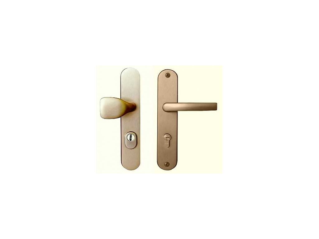 Kování je vyrobené z eloxovaného hliníku, vybavené svorníky proti odvrtání, pevnostními šrouby a kalenou ocelovou deskou chránící vložku zámku.