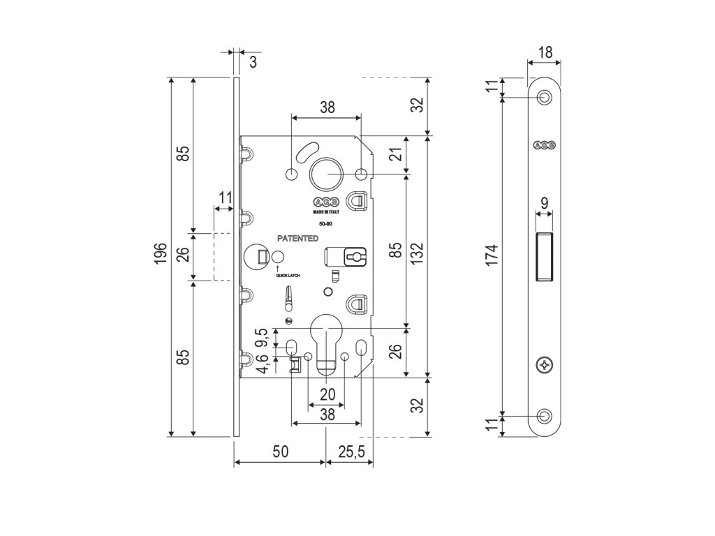 Dormas: 50 mm (vzdálenost osy kliky od lišty zámku)