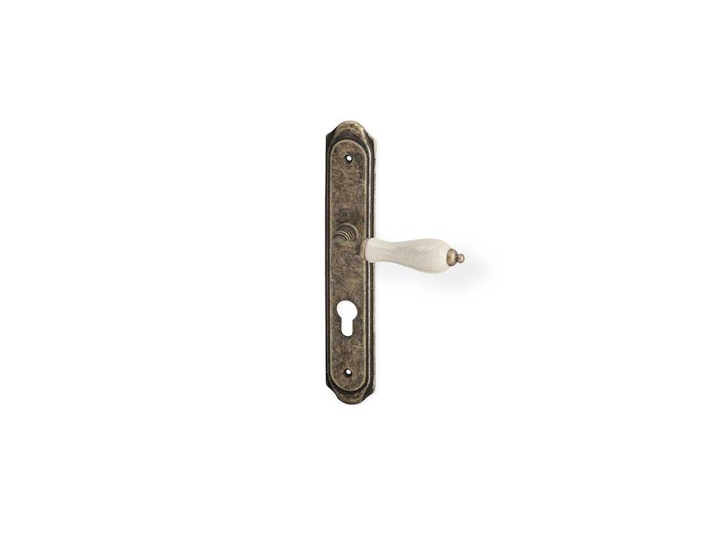 Rustikální kování s patinovanou povrchovou úpravou doplněné porcelánovým madélkem. Pro tento typ povrchu platí, že díky ručnímu opracování má každý kus svou specifickou kresbu a každý kus je tak svým způsobem originálem.