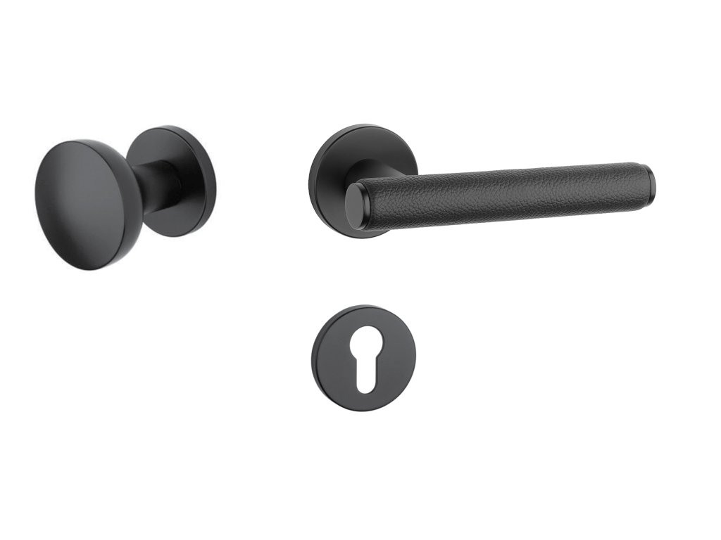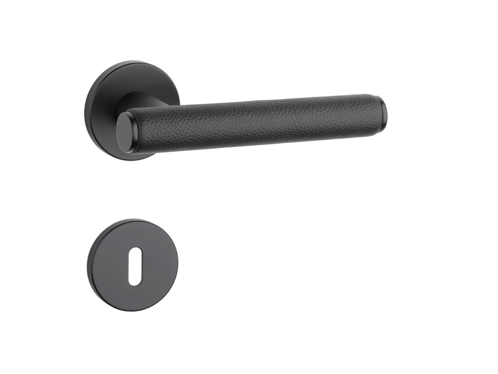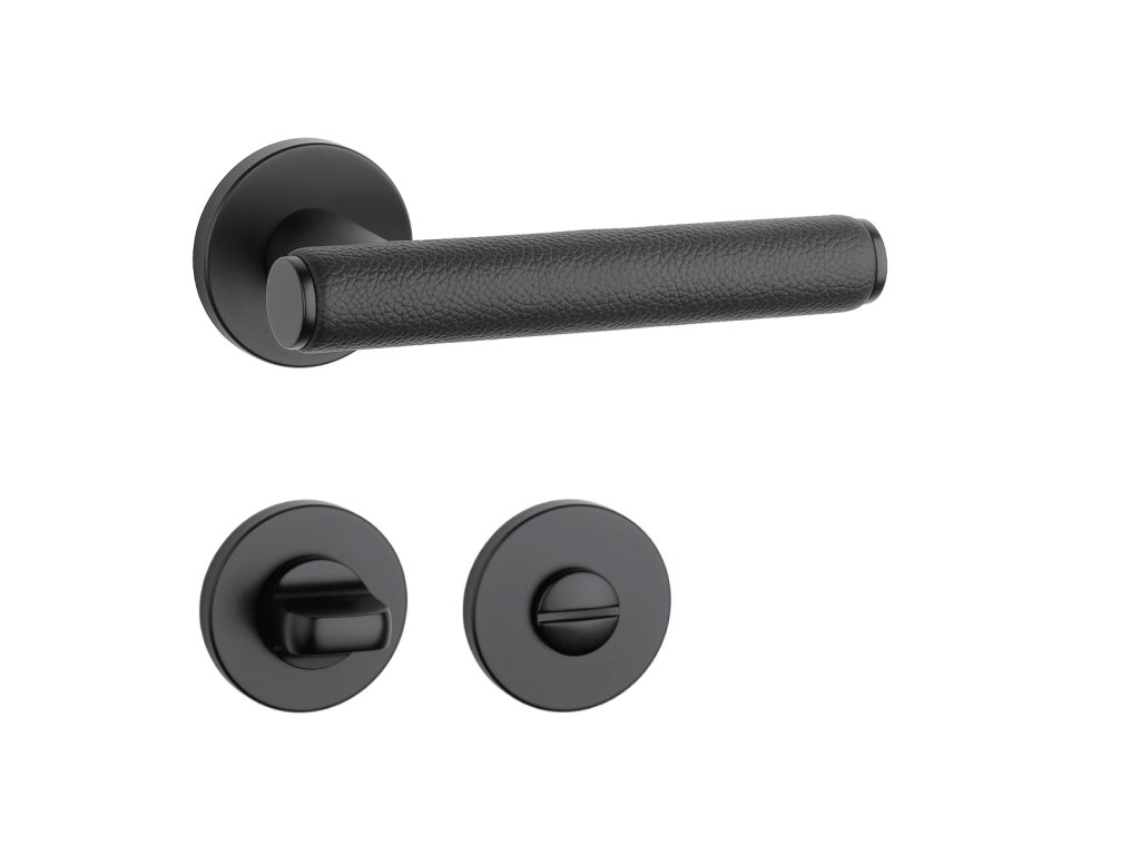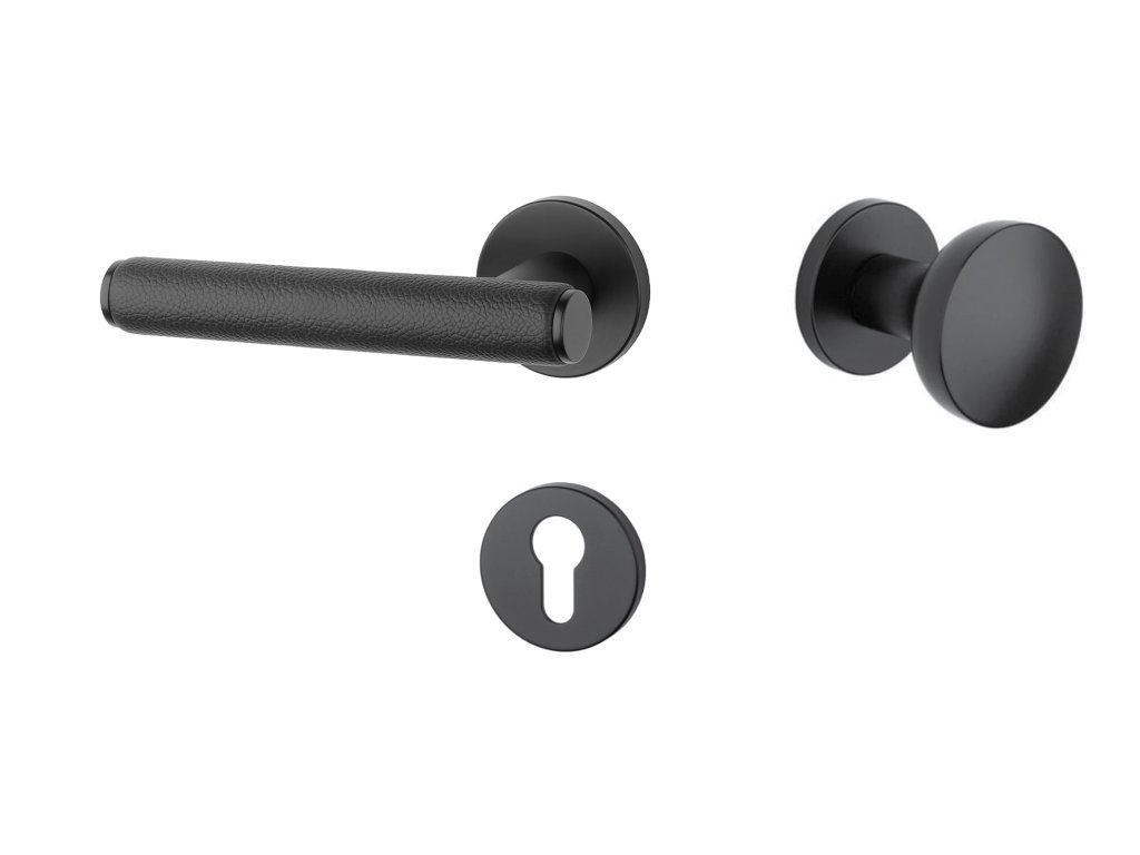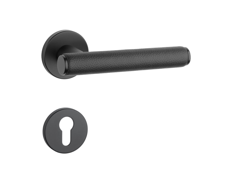Rozetová klika na interiérové dveře s kulatou rozetou je vyrobena z materiálů vysoké kvality - zamak a je povrchově upravena. Zajímavým prvkem je černá kůže, která obepíná rukojeť kliky.