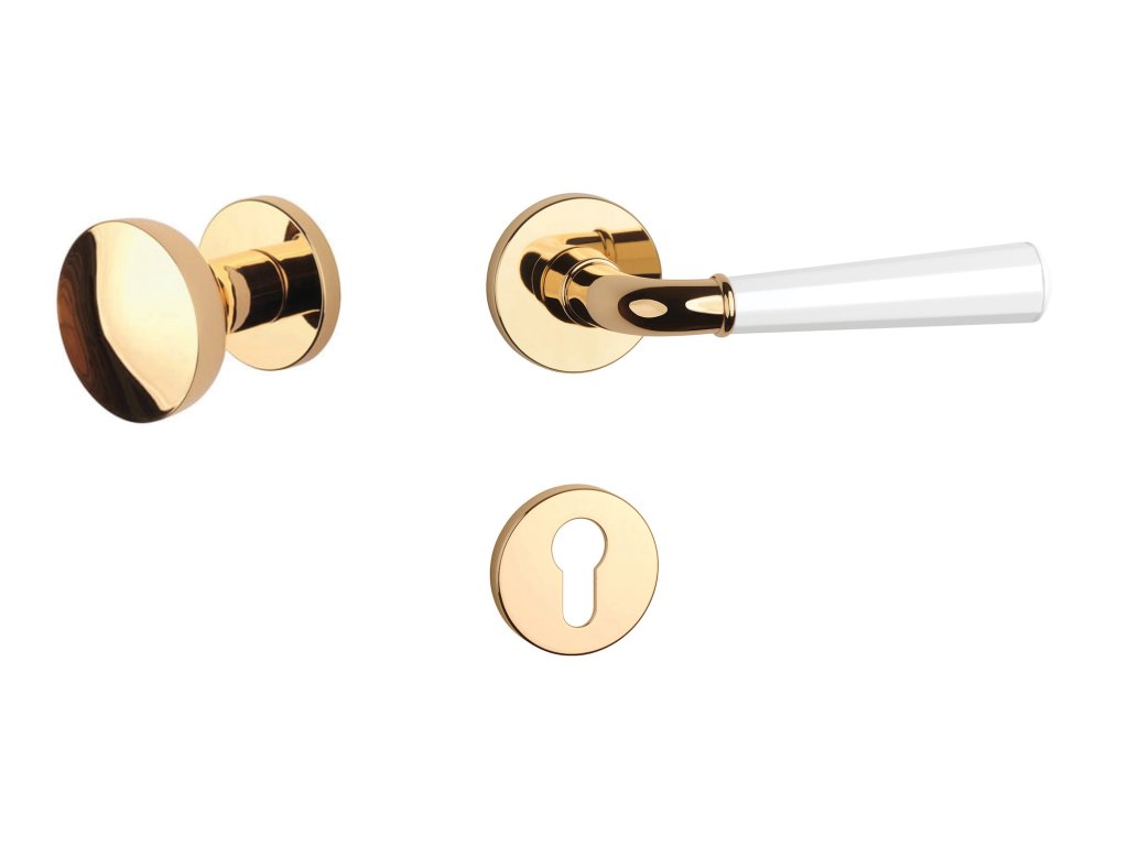 Základním materiálem použitým u klik MARIGOLD je zamak (slitina zinku) s lesklým povrchem. Kliky jsou na kulatých rozetách s průměrem 52 mm a tloušťkou jen 7 mm.