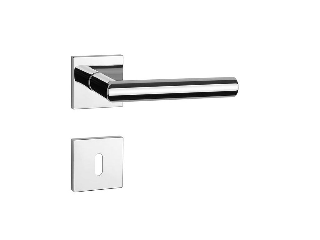 Rozetová klika na interiérové dveře s hranatou rozetou je vyrobena z materiálů vysoké kvality - zamak a je povrchově upravena. Rozeta má rozměr 52x52 mm a tloušťku jen 7 mm. Minimalistický design rozety s vysokou stabilitou kliky na dveřích působí jemně, a tím ponechává prostor pro vyniknutí designu samotné kliky.