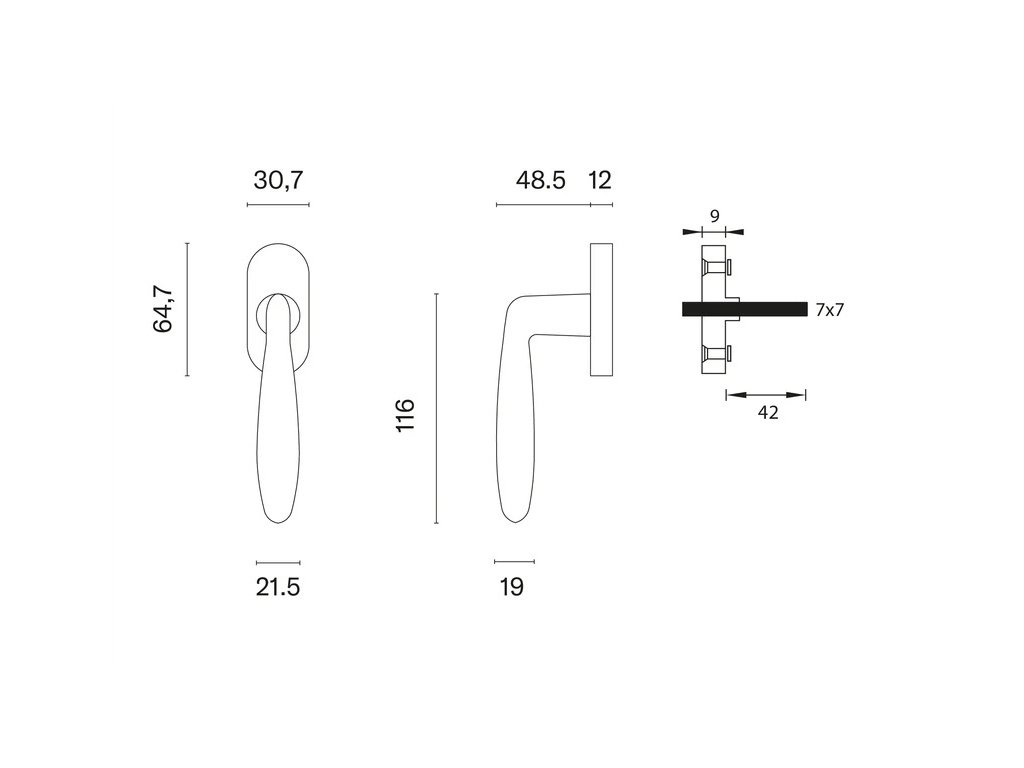 Rozeta má rozměry 64,5 x 30 mm a tloušťku 12 mm.
