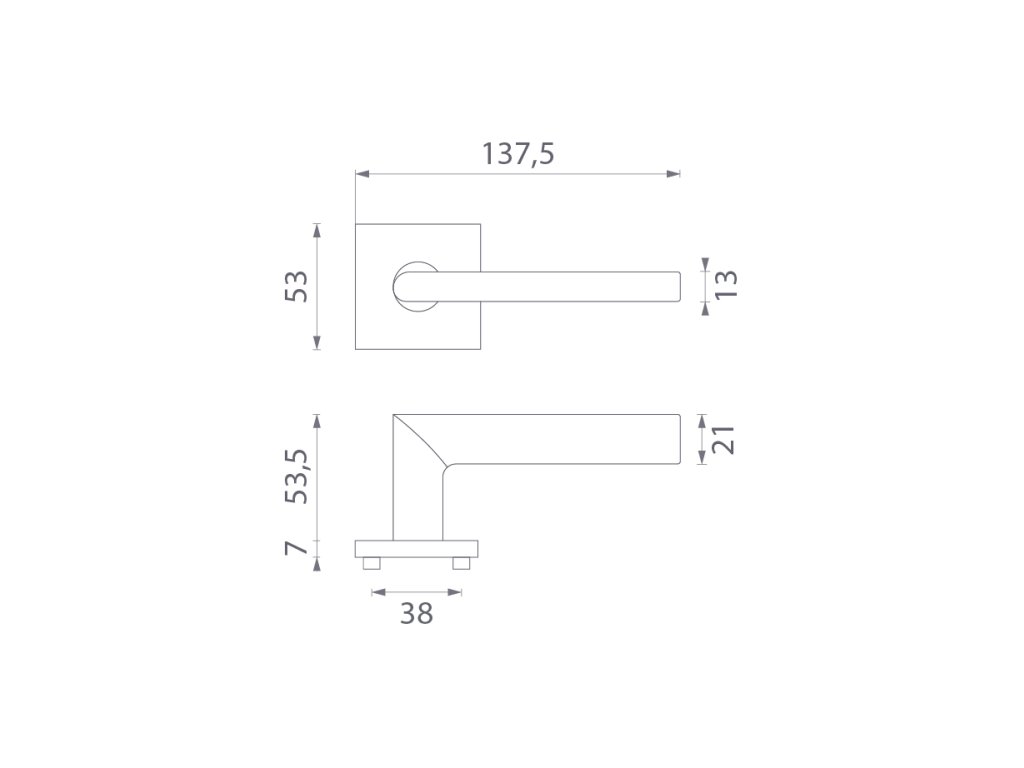 Rozetová klika na interiérové dveře s hranatou rozetou je vyrobena z materiálů vysoké kvality - zamak a je povrchově upravena. Rozeta má rozměr 53x53 mm a tloušťku jen 7 mm. Minimalistický design rozety s vysokou stabilitou kliky na dveřích působí jemně, a tím ponechává prostor pro vyniknutí designu samotné kliky.