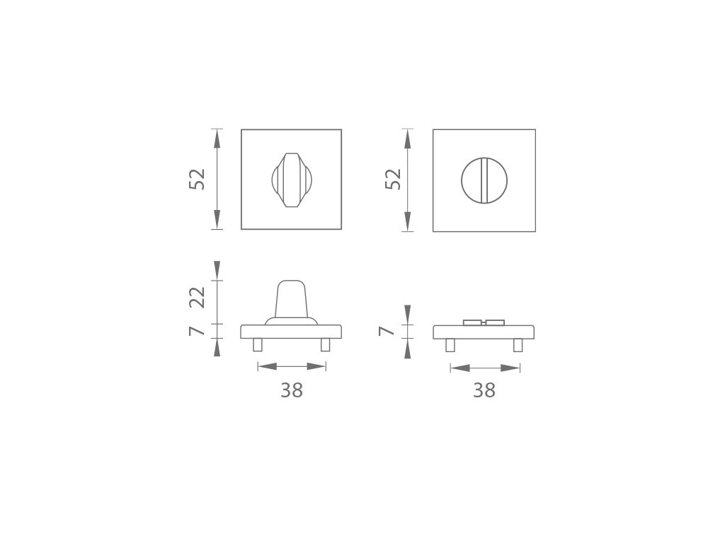 Hranatá rozeta je vyrobena z materiálů vysoké kvality - zamak a je povrchově upravena. Rozeta má rozměr 52x52 mm, tloušťku 7 mm a oválný otvor pro interiérový klíč (BB), otvor pro cylindrickou vložku (PZ), WC set s vmontovaným klíčem. Balení obsahuje 2 kusy rozet (pár) a rozety WC jsou v balení jako set.