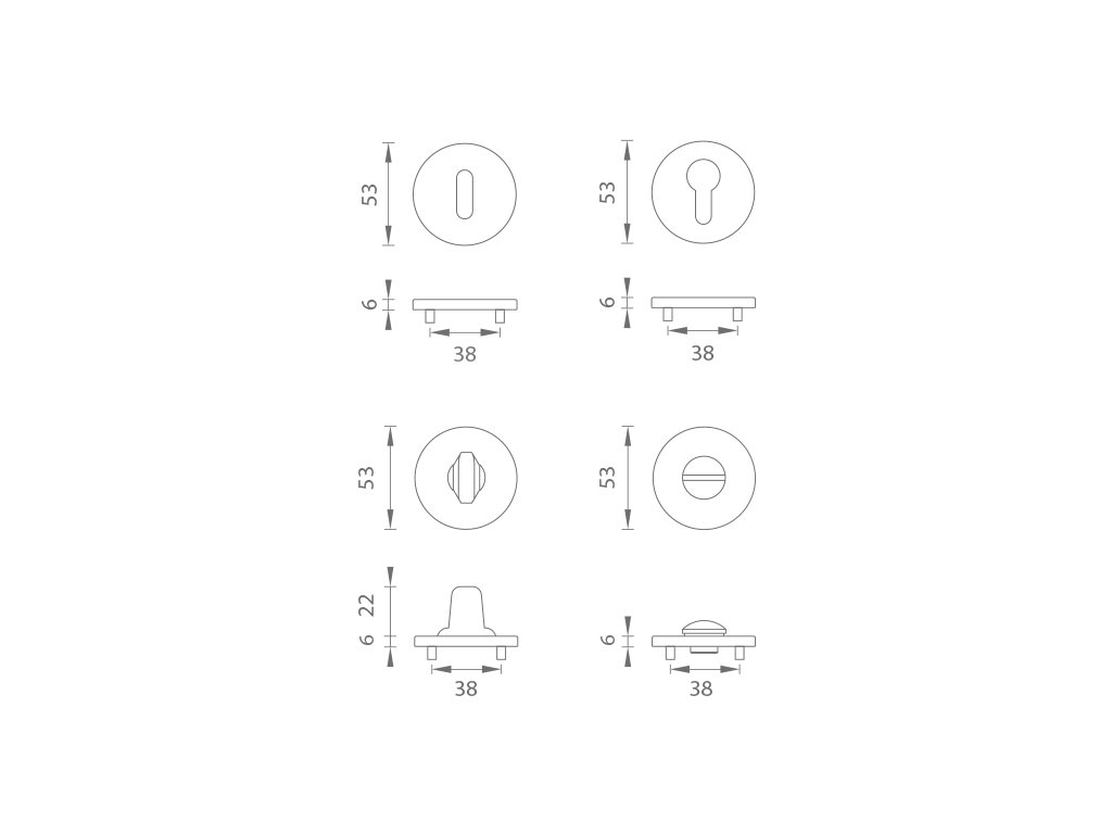 Kulatá rozeta je vyrobena z materiálů vysoké kvality - zamak a je povrchově upravena. Rozeta má průměr 52 mm, tloušťku 7 mm a oválný otvor pro interiérový klíč (BB), otvor pro cylindrickou vložku (PZ), WC set s vmontovaným klíčem. Balení obsahuje 2 kusy rozet (pár) a rozety WC jsou v balení jako set.
