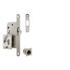 Hranatý set na posuvné dveře s otvorem pro interiérový klíč (BB) s rozměry čela zámku v délce 160 mm, šířce 18 mm, tloušťce 2 mm. Rozteč (vzdálenost mezi otvorem na kliku a vložkou / klíčem) - 72 mm, zádlab - 65 mm a dormas (vzdálenost osy kliky od lišty zámku) - 50 mm.