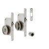 Kulatý set na posuvné dveře s WC klíčem s rozměry čela zámku v délce 160 mm, šířce 18 mm, tloušťce 2 mm. Rozteč (vzdálenost mezi otvorem na kliku a vložkou / klíčem) - 72 mm, zádlab - 65 mm a dormas (vzdálenost osy kliky od lišty zámku) - 50 mm.