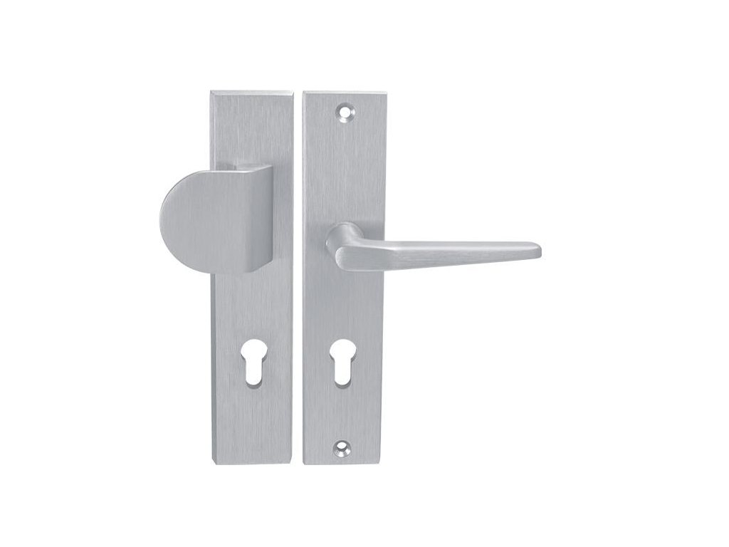 Štítová klika na vchodové a bezpečnostní dveře s bezpečnostním hranatým štítem bez překrytí cylindrické vložky je vyrobena z hliníku a je povrchově upravena. Hranatý štít má rozměry 52 mm x 242 mm a tloušťku 15 mm.