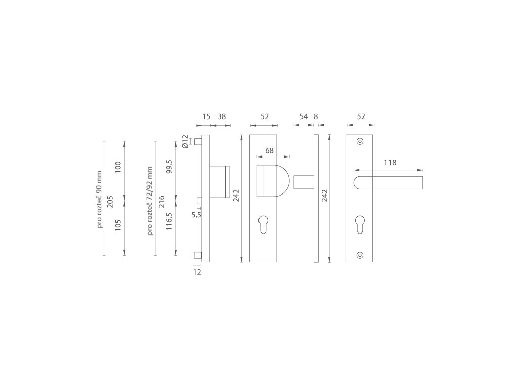 U bezpečnostního kování je třeba znát vzdálenost mezi osou kliky a osou klíče (rozteč). Standardní vzdálenost je 72, 90 nebo 92 mm. Kování s roztečí 72 a 90 mm je standardem pro tloušťku dveří od 38 mm do 50 mm. Kování s roztečí 92 mm je standardem pro tloušťku dveří od 68 mm do 78 mm.