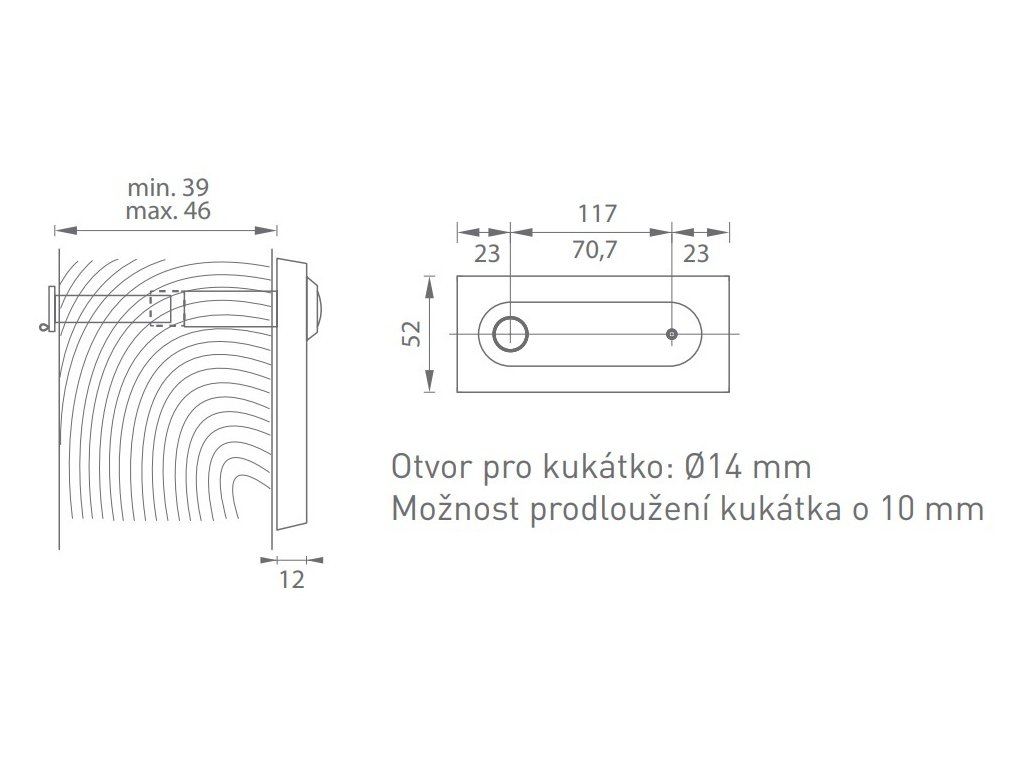 Dveřní kukátko se jmenovkou je vyrobeno z hliníku a je povrchově upraveno. Celkové rozměry hranatého kukátka se jmenovkou jsou 117 mm x 52 mm x 12 mm. Vhodné pro dveře o šířce min. 39 mm a max. 46 mm. Otvor pro kukátko: Ø14 mm. Možnost prodloužení kukátka o 10 mm. Na toto kukátko je prodloužená záruka 10 let.