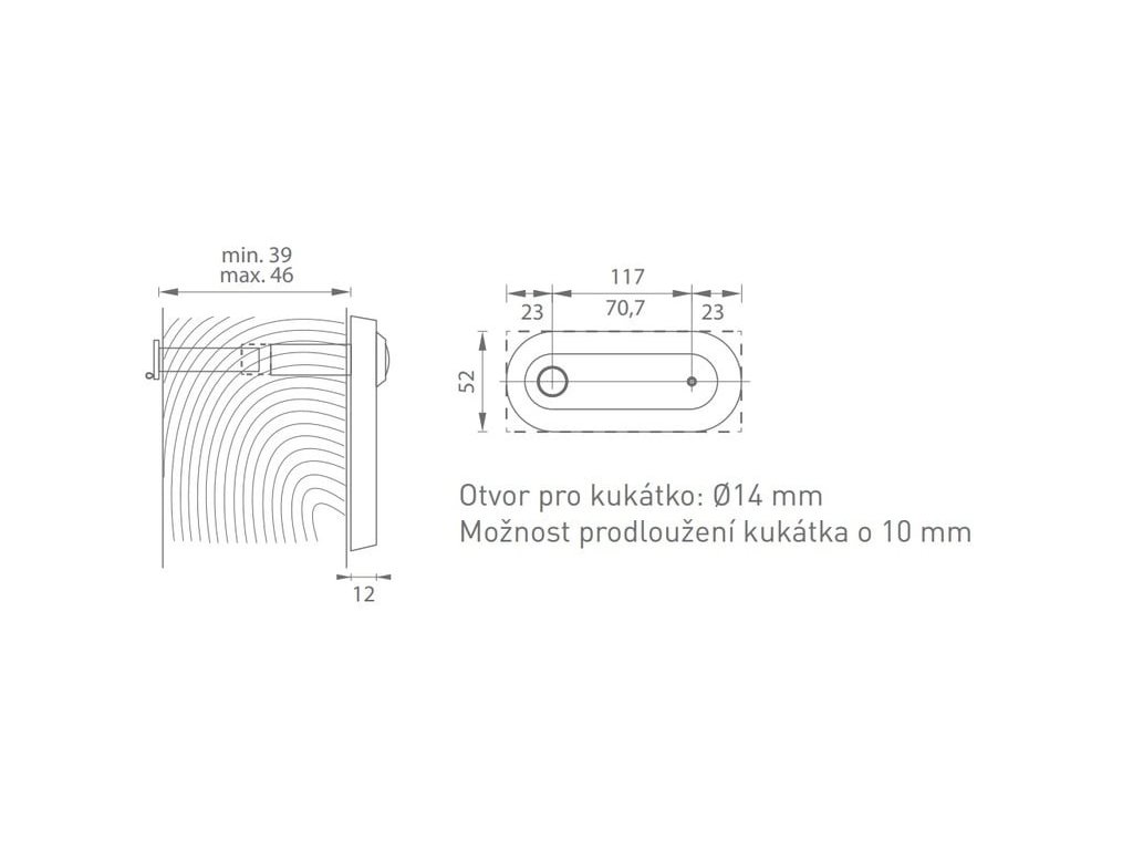 Dveřní kukátko se jmenovkou je vyrobeno z hliníku a je povrchově upraveno. Celkové rozměry kulatého kukátka se jmenovkou jsou 117 mm x 52 mm x 12 mm. Vhodné pro dveře o šířce min. 39 mm a max. 46 mm. Otvor pro kukátko: Ø14 mm. Možnost prodloužení kukátka o 10 mm. Na toto kukátko je prodloužená záruka 10 let.