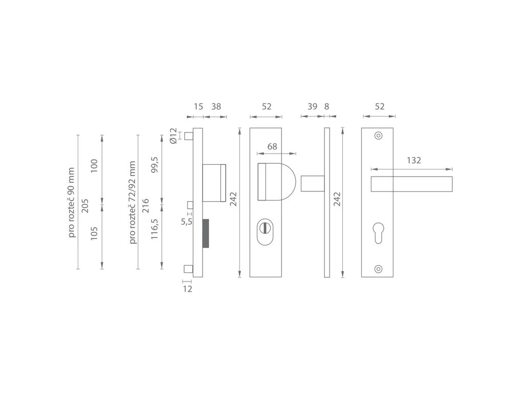 Štítová klika na vchodové a bezpečnostní dveře s bezpečnostním hranatým štítem s překrytím cylindrické vložky je vyrobena z hliníku a je povrchově upravena. Hranatý štít má rozměry 52 mm x 242 mm a tloušťku 8 resp. 15 mm.