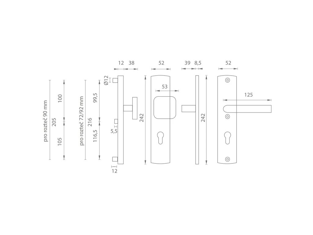 U bezpečnostního kování je třeba znát vzdálenost mezi osou kliky a osou klíče (rozteč). Standardní vzdálenost je 72, 90 nebo 92 mm. Kování s roztečí 72 a 90 mm je standardem pro tloušťku dveří od 38 mm do 50 mm. Kování s roztečí 92 mm je standardem pro tloušťku dveří od 68 mm do 78 mm.
