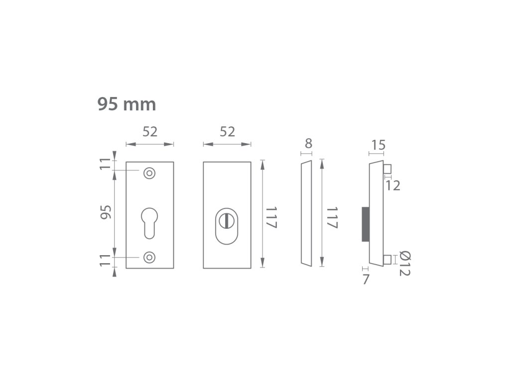 Přídavná rozeta s PZ PLUS otvorem pro vložku se vzdáleností otvorů pro šrouby 95 mm má celkovou délku 117 mm a tloušťku 15 mm.
