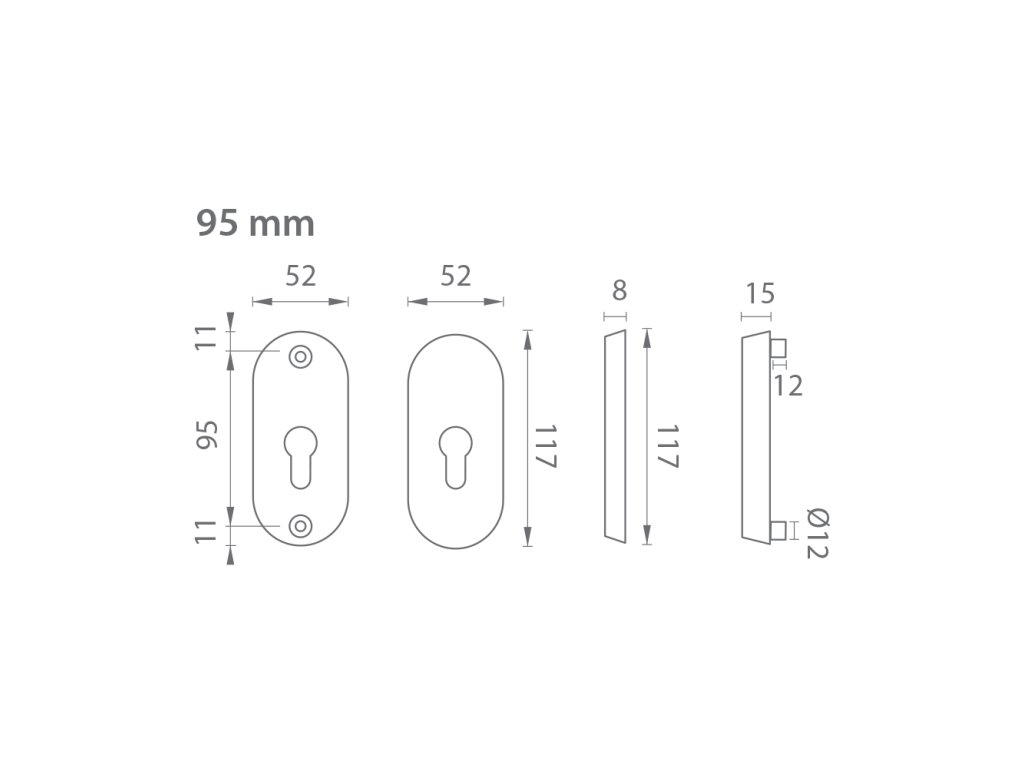 Přídavná rozeta s PZ otvorem pro vložku se vzdáleností otvorů pro šrouby 95 mm má celkovou délku 117 mm a tloušťku 15 mm.