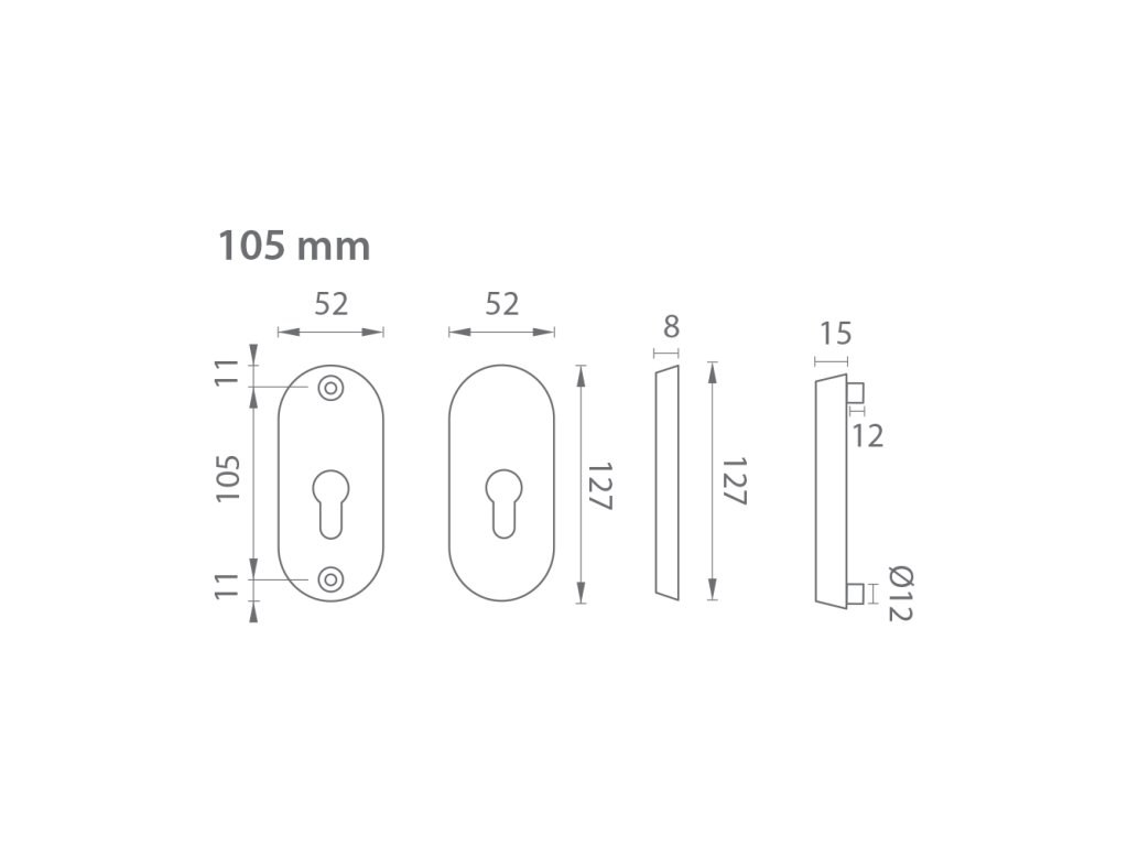 Přídavná rozeta s PZ otvorem pro vložku se vzdáleností otvorů pro šrouby 105 mm má celkovou délku 127 mm a tloušťku 15 mm.