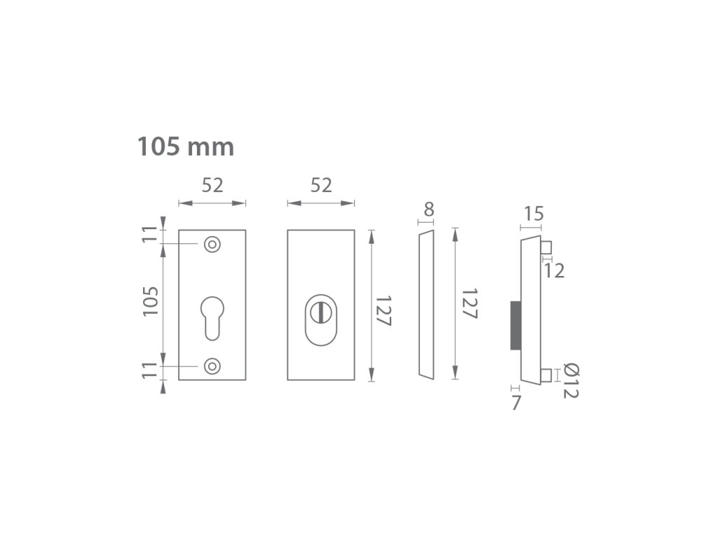 Přídavná rozeta s PZ PLUS otvorem pro vložku se vzdáleností otvorů pro šrouby 105 mm má celkovou délku 127 mm a tloušťku 15 mm.