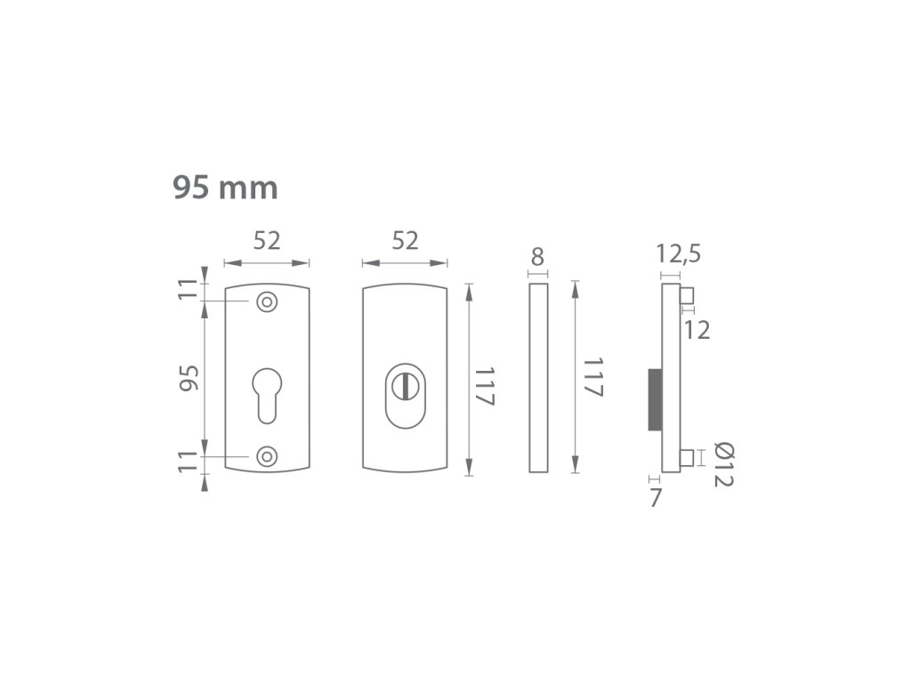 Přídavná rozeta s PZ PLUS otvorem pro vložku se vzdáleností otvorů pro šrouby 95 mm má celkovou délku 117 mm a tloušťku 15 mm.