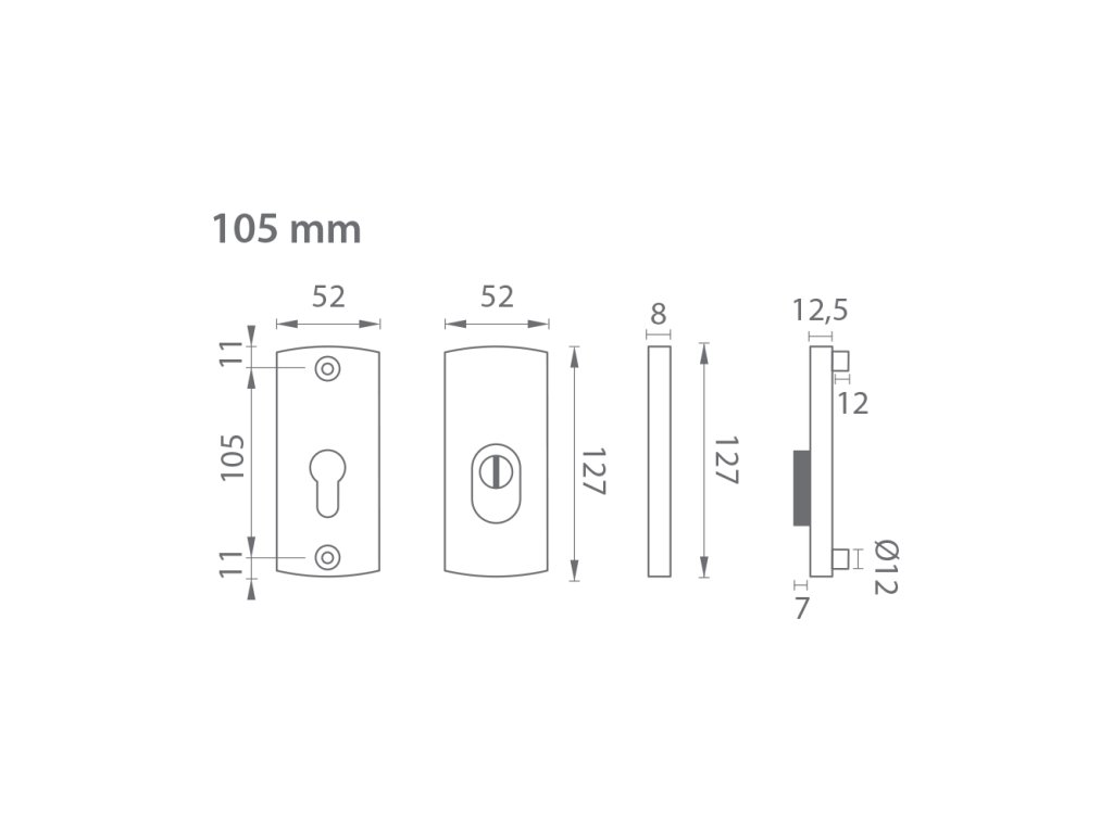 Přídavná rozeta s PZ PLUS otvorem pro vložku se vzdáleností otvorů pro šrouby 105 mm má celkovou délku 127 mm a tloušťku 15 mm.
