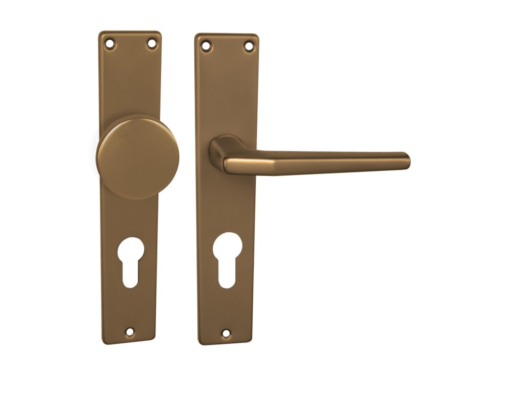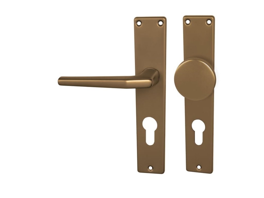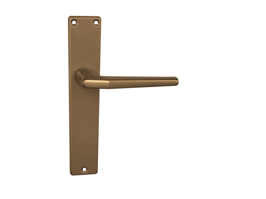Štítová klika na interiérové dveře s hranatým štítem je vyrobena z hliníku a je povrchově upravena. Hranatý štít má rozměry 43 mm x 215 mm a klika neobsahuje vratný mechanismus.