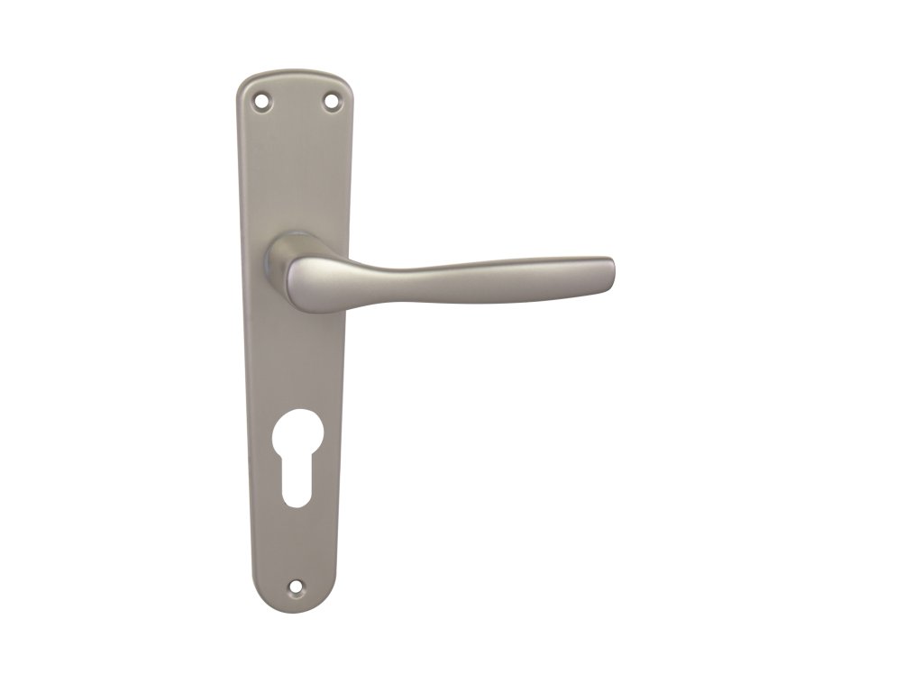 Štítová klika na interiérové dveře s oválným štítem je vyrobena z hliníku a je povrchově upravena. Oválný štít má rozměry 42 mm x 206 mm a klika neobsahuje vratný mechanismus.