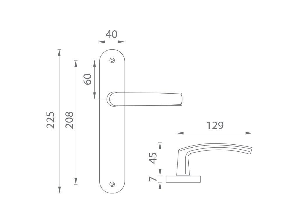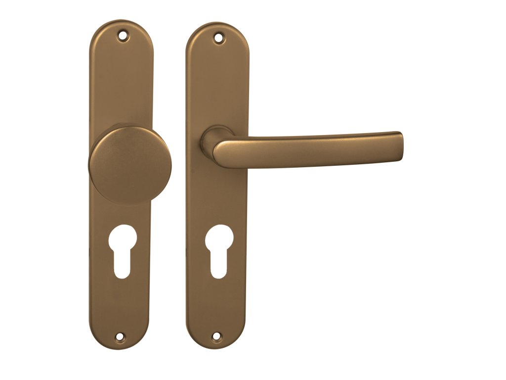 Štítová klika na interiérové dveře s oválným štítem je vyrobena z hliníku a je povrchově upravena. Oválný štít má rozměry 40 mm x 225 mm a klika neobsahuje vratný mechanismus.