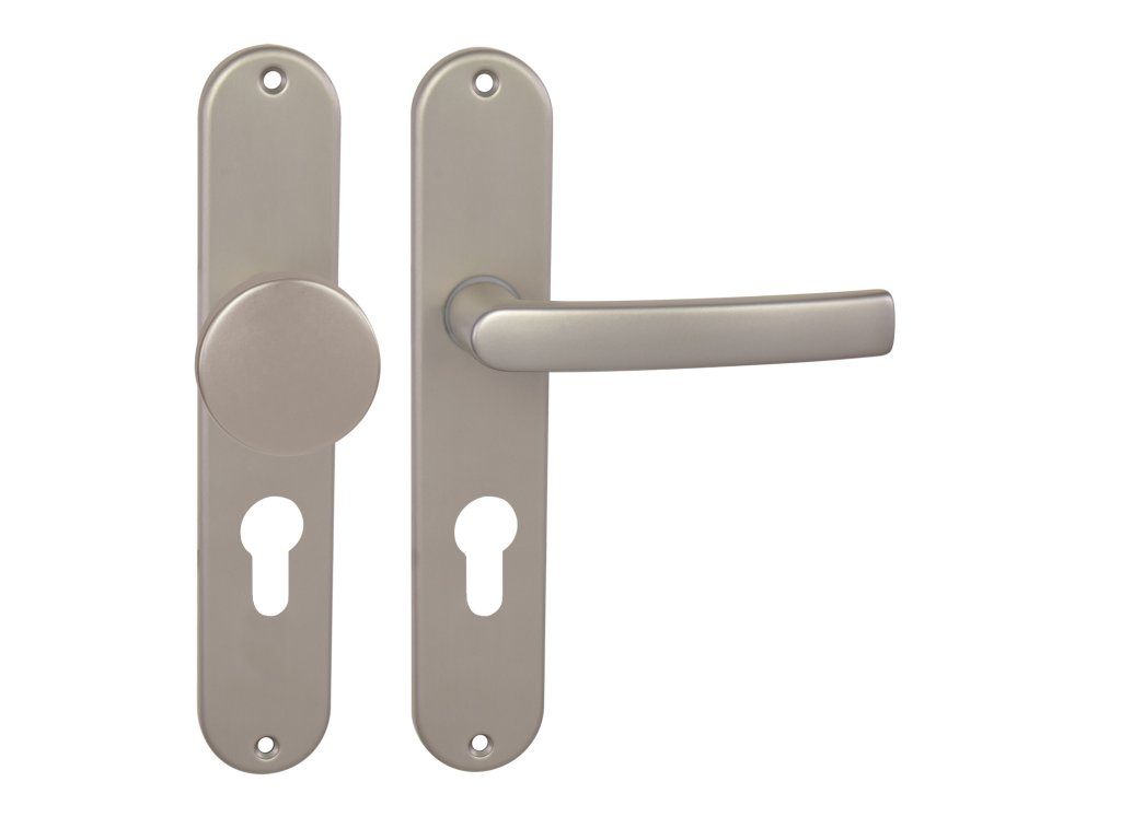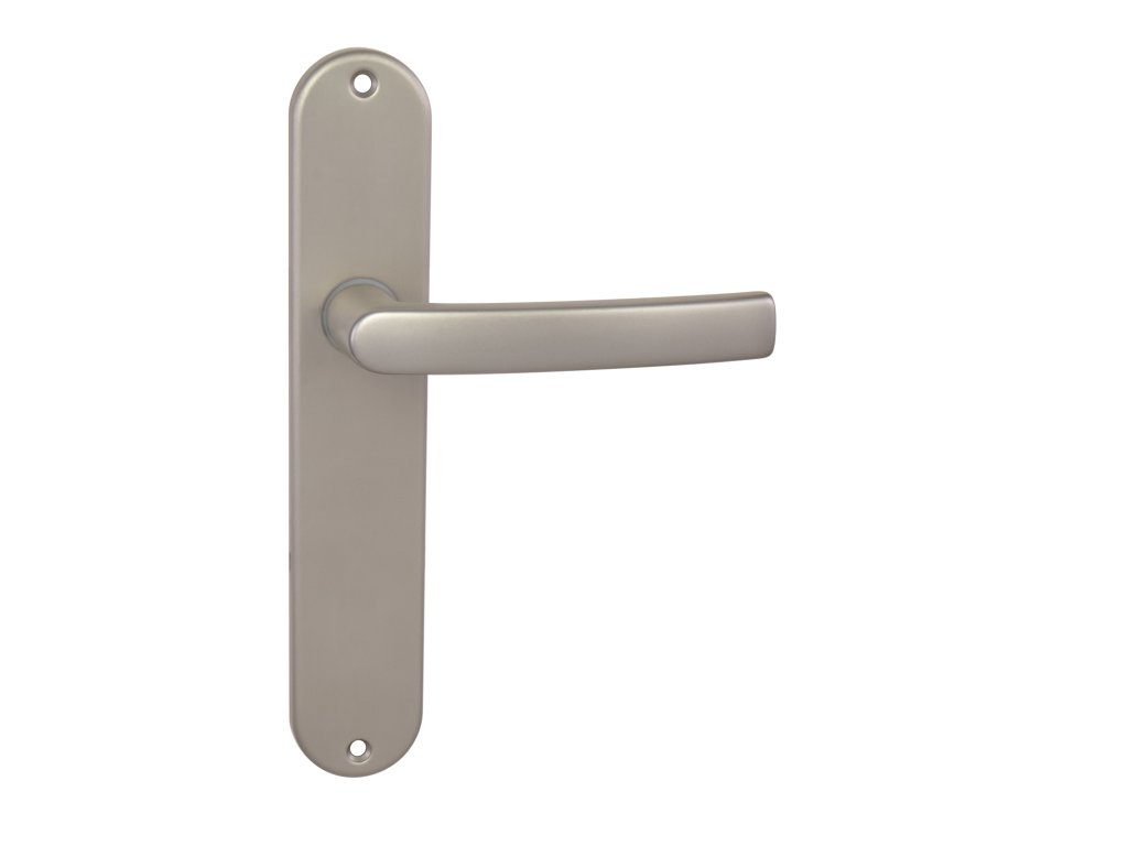 Štítová klika na interiérové dveře s oválným štítem je vyrobena z hliníku a je povrchově upravena. Oválný štít má rozměry 40 mm x 225 mm a klika neobsahuje vratný mechanismus.