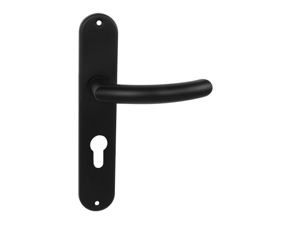 Štítová klika na interiérové dveře s oválným štítem je vyrobená z hliníku a je povrchově upravená. Oválný štít má rozměry 42 mm x 206 mm a klika neobsahuje vratný mechanismus.
