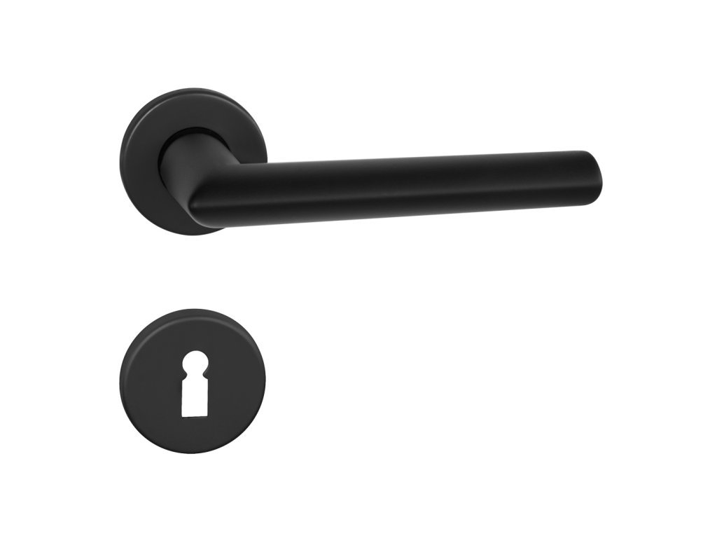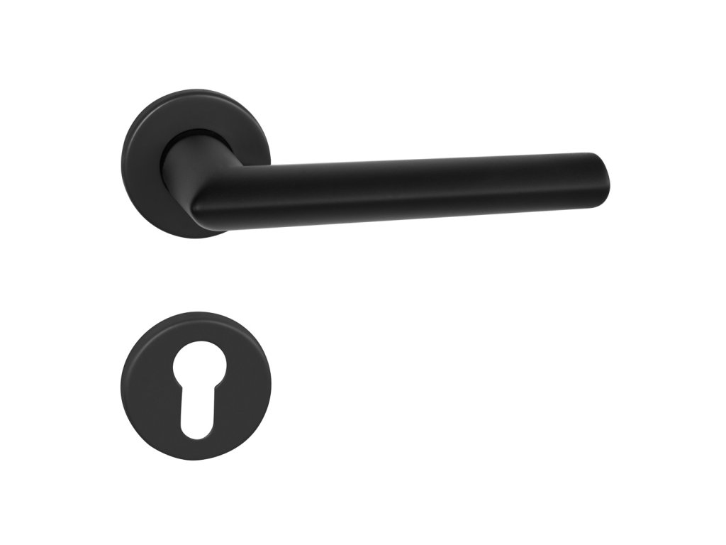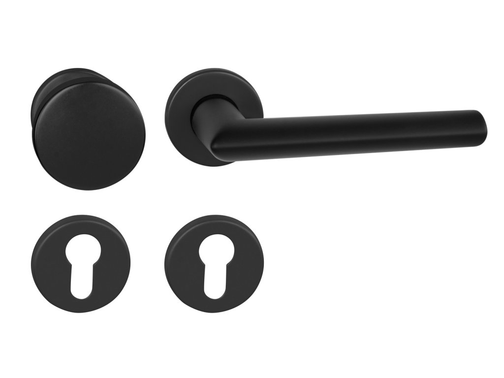 Rozetová klika na interiérové dveře s kulatou rozetou je vyrobena z hliníku a je povrchově upravena. Rozeta má průměr 50 mm a tloušťku 7 mm. Klika neobsahuje vratný mechanismus kliky – pružinu a mechanika kliky je uložená v plastovém pouzdře.