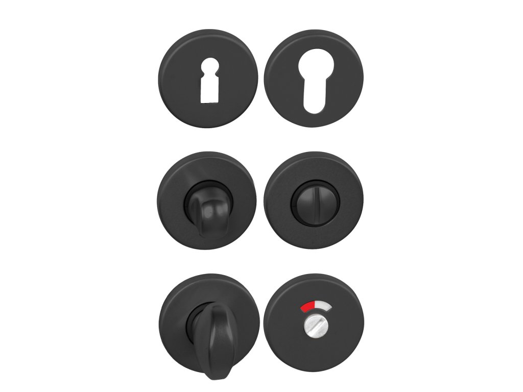 Kulatá rozeta je vyrobena z hliníku a je povrchově upravena. Rozeta má průměr 50 mm, tloušťku 7 mm a oválný otvor pro interiérový klíč (BB), otvor pro cylindrickou vložku (PZ) , WC set s vmontovaným klíčem a ukazatelem. Balení obsahuje 2 kusy rozet (pár) a rozety WC jsou v balení jako set.