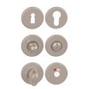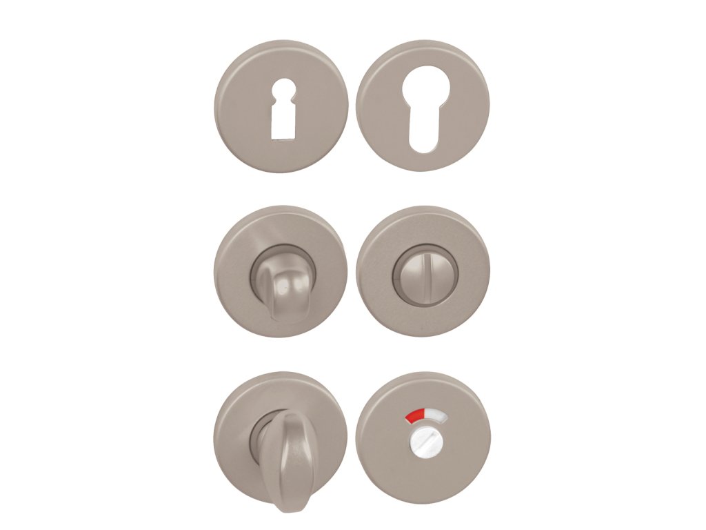 Kulatá rozeta je vyrobena z hliníku a je povrchově upravena. Rozeta má průměr 50 mm, tloušťku 7 mm a oválný otvor pro interiérový klíč (BB), otvor pro cylindrickou vložku (PZ) , WC set s vmontovaným klíčem a ukazatelem. Balení obsahuje 2 kusy rozet (pár) a rozety WC jsou v balení jako set.