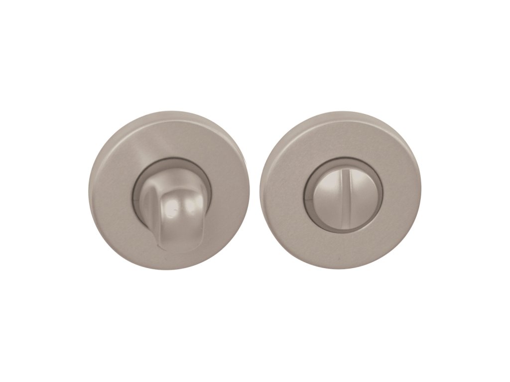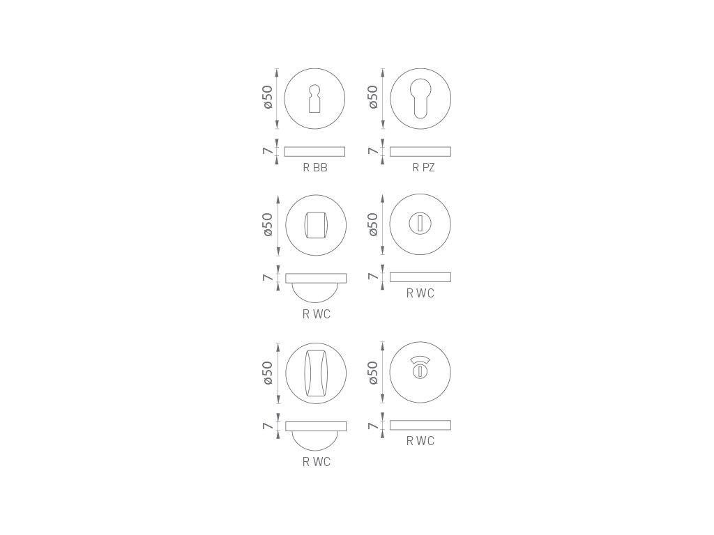 Kulatá rozeta je vyrobena z hliníku a je povrchově upravena. Rozeta má průměr 50 mm, tloušťku 7 mm a oválný otvor pro interiérový klíč (BB), otvor pro cylindrickou vložku (PZ) , WC set s vmontovaným klíčem a ukazatelem. Balení obsahuje 2 kusy rozet (pár) a rozety WC jsou v balení jako set.