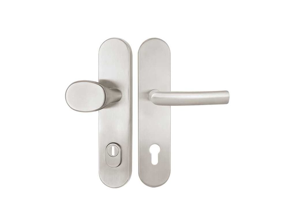 Bezpečnostní štítové kování na vchodové dveře s oválnými štíty a s překrytím vložky.