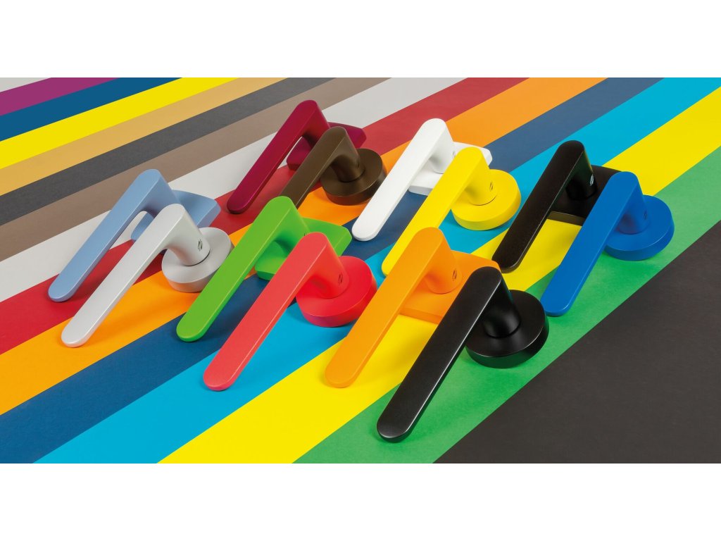 Minimalistický design rozety dává prostor pro vyniknutí výrazné barvy samotné kliky.
