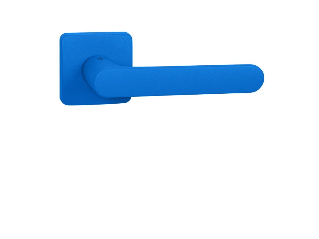 Barevná rozetová klika na interiérové dveře MOOD ONEQ s hranatou rozetou je vyrobena z materiálů vysoké kvality a je povrchově upravena.