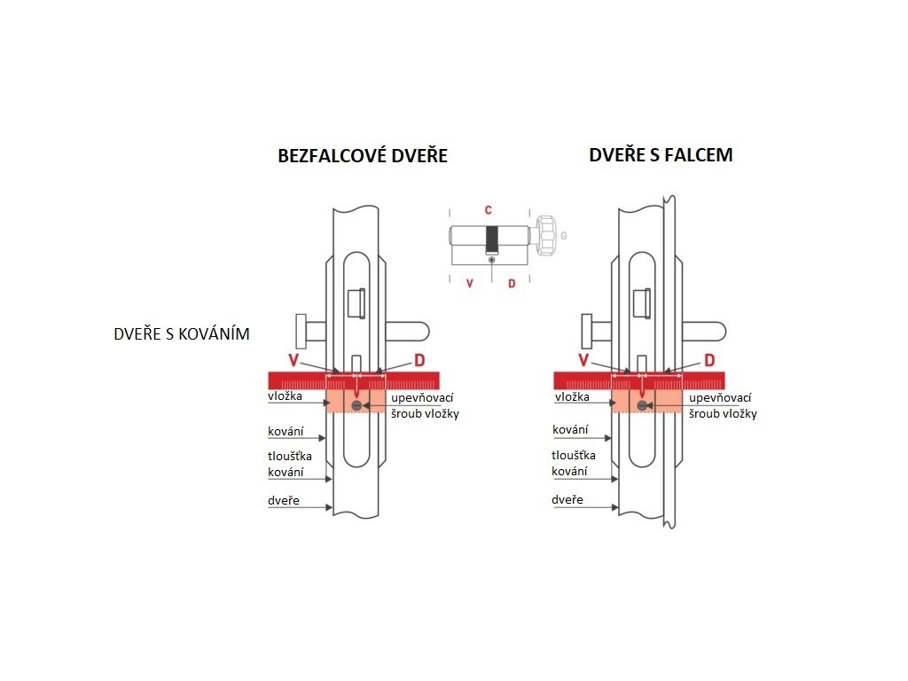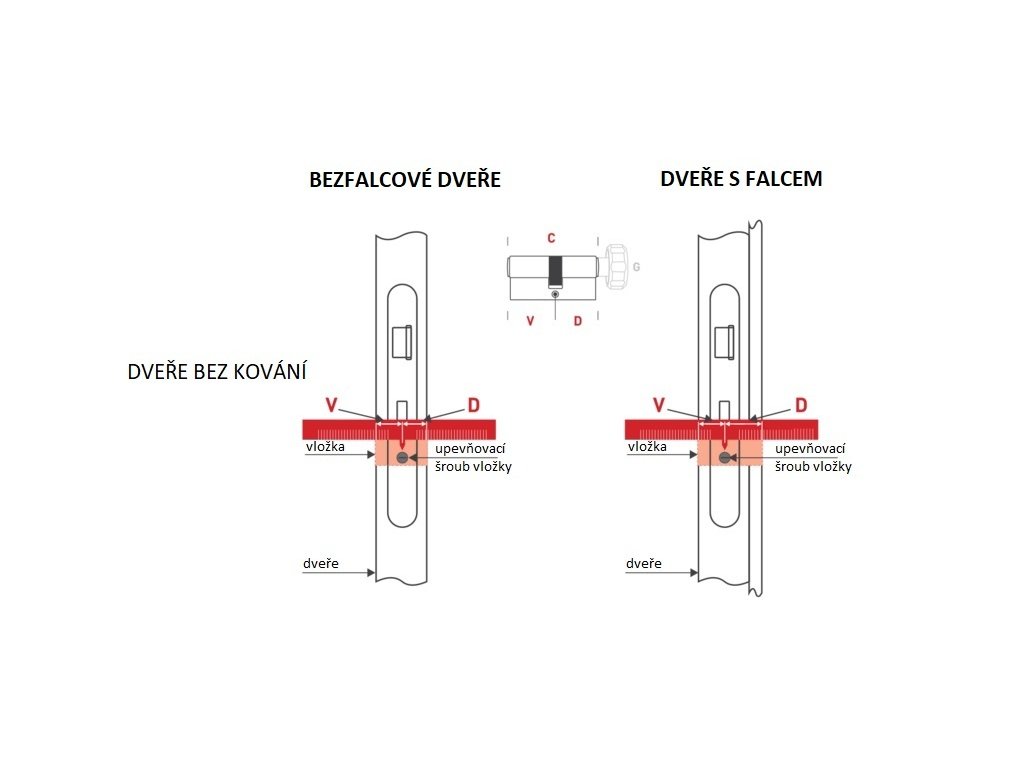 Pro určení přesného rozměru cylindrické vložky musí být kromě tloušťky dveří zohledněno také použití kování a nebo rozeta (je potřebné připočítat k tloušce dveří). Pro dveře s falcem je také nutné zohlednit posunutou osovou polohu středu zadlabávacího zámku. Rozměr cylindrické vložky stanovíme po instalaci zadlabávacího zámku a to tak, že od středu upevňovacího šroubu vložky v čele zadlabávacího zámku naměříme nejprve rozměr V - ven (nalevo od středu upevňovacího šroubu vložky v čele zadlabávacího zámku) a potom rozměr D - dovnitř (napravo od středu upevňovacího šroubu vložky v čele zadlabávacího zámku). V případe, že ještě nemáte kování namontované na dveřích, změřte rozměr jen po hranu dveří (V i D). Následně vám při koupi kování délku vložky dopočítají naši pracovníci a nebo obchodní partneři podle druhu zakoupeného kování.