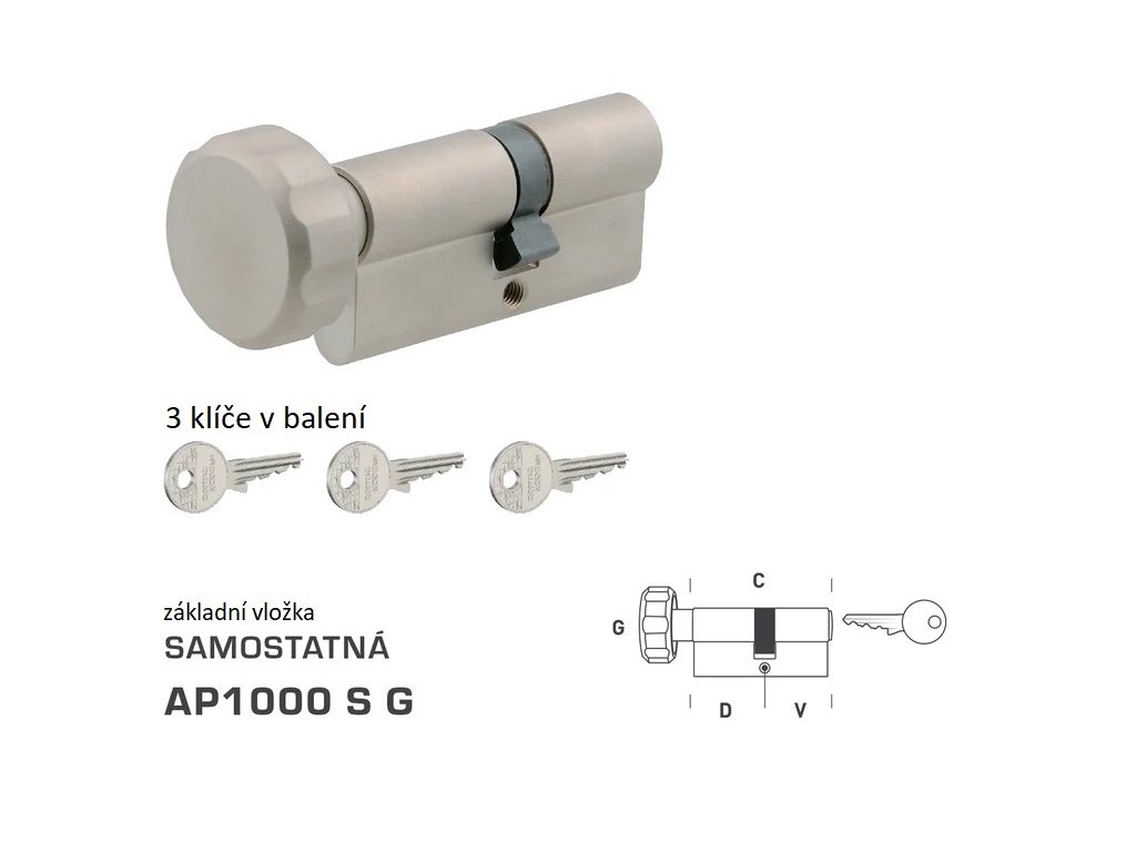 Precizní zpracování a kvalitní materiály zaručují dlouhou životnost a funkčnost oboustranné cylindrické bezpečnostní vložky AP1000 S G (s knoflíkem).