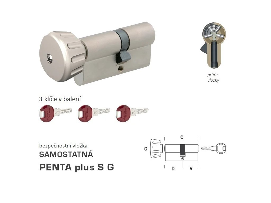 PENTA plus S G je samostatná bezpečnostní vložka s možností sjednocení více vložek na společný klíč.