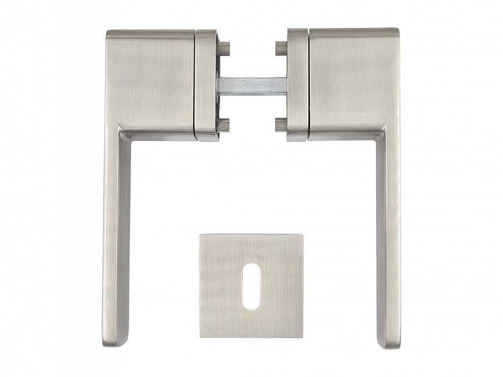 Kovové kování na dveře s obdelníkovými rozetami pod klikami a se čtvercovými rozetami na klíč nebo vložku.
