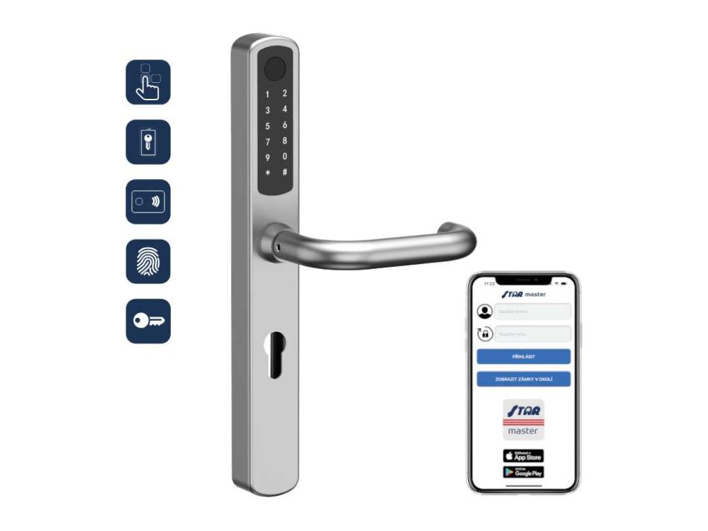 Elektromechanické štítové kování pro odemykání smartphonem, kódem nebo čipem, také ve variantě s integrovanou čtečkou otisků prstů