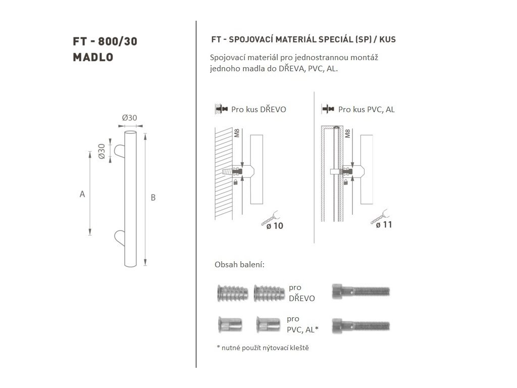 Madlo na dveře je vyrobeno z vysoce kvalitní nerezavějící oceli, známé jako nerez a je povrchově upraveno. Profil madla je 30 mm. Sada SPECIÁL (SP) obsahuje spojovací materiál pro jednostrannou montáž jednoho madla do dřeva, PVC, AL. Madlo s délkou 1600, 1800 a 2000 mm má 3 úchyty.