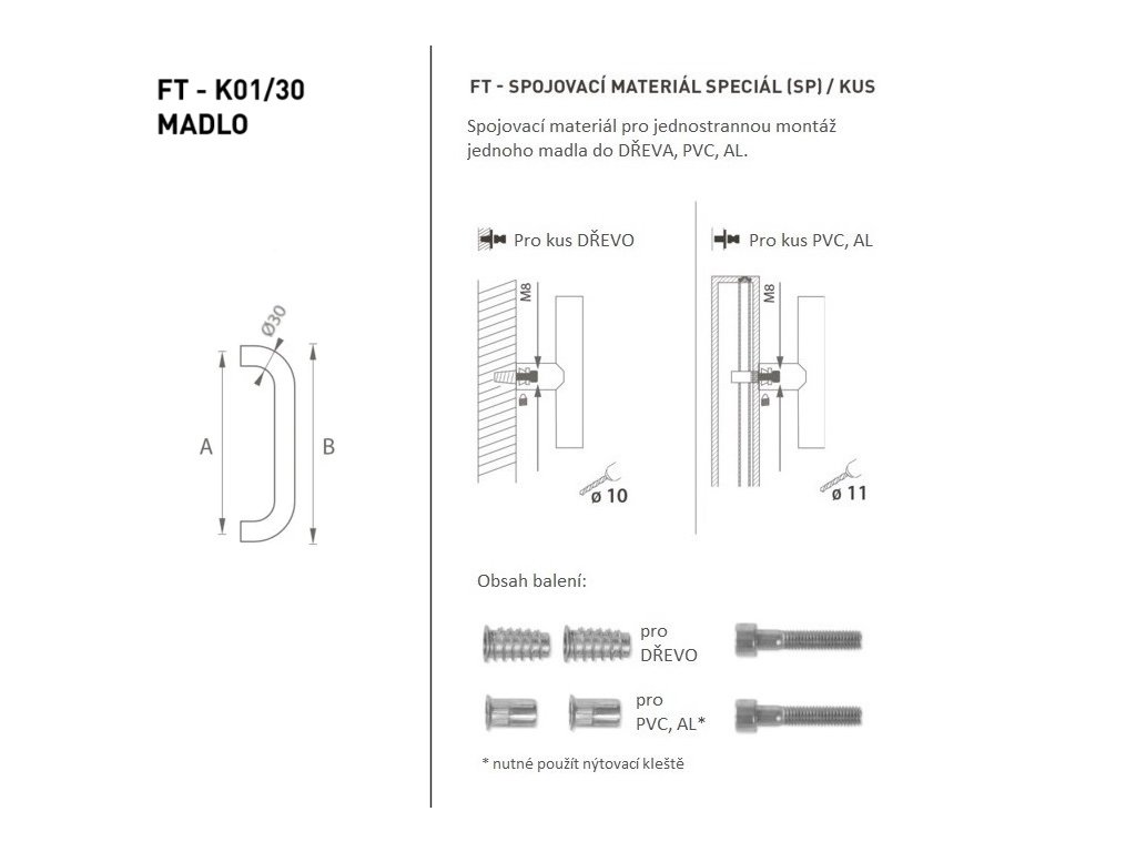 Sada SPECIÁL (SP) obsahuje spojovací materiál pro jednostrannou montáž jednoho madla do dřeva, PVC, AL.