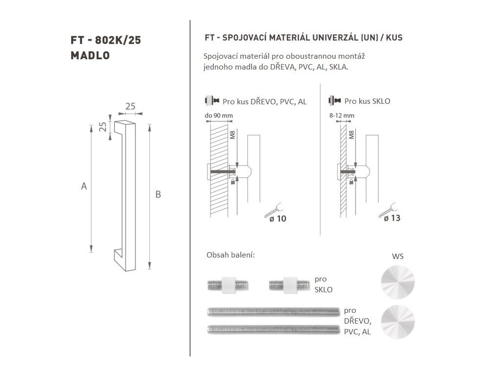 Madlo na dveře je vyrobeno z vysoce kvalitní nerezavějící oceli, známé jako nerez a je povrchově upraveno. Profil madla je 25 x 25 mm. Sada UNIVERZÁL (UN) obsahuje spojovací materiál pro oboustrannou montáž jednoho madla do dřeva, PVC, AL, skla.