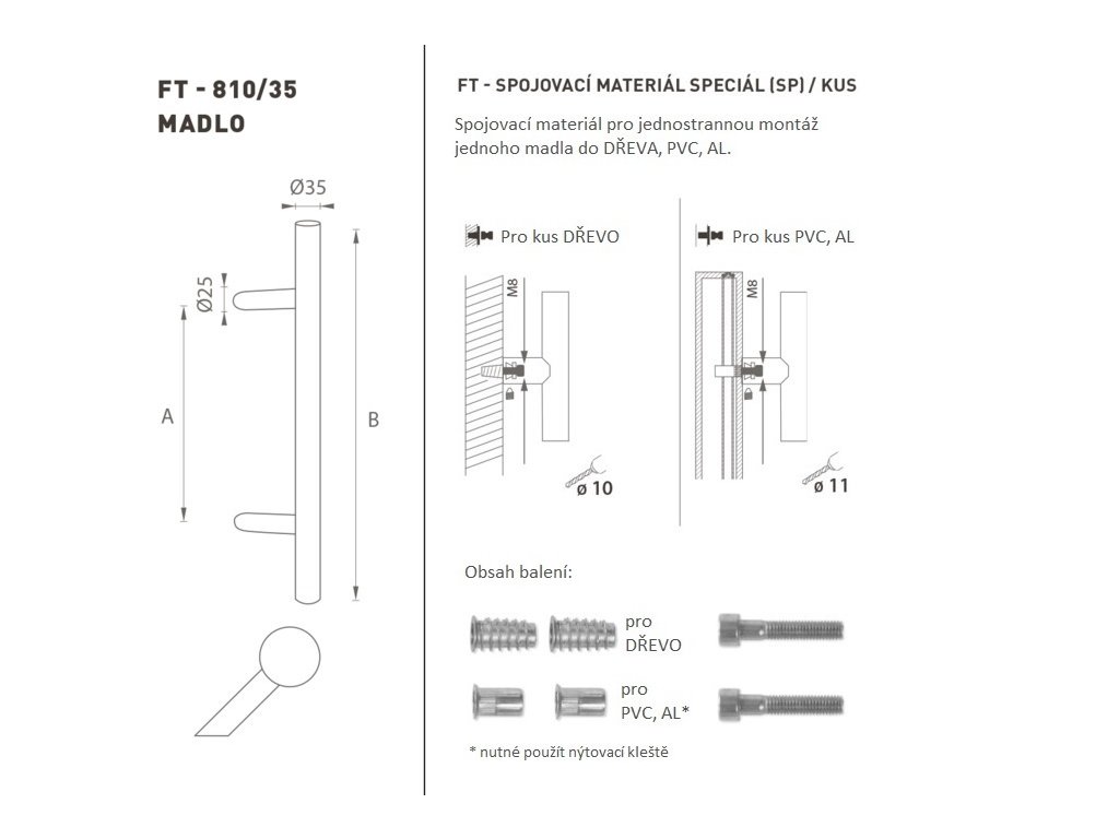 Madlo na dveře je vyrobeno z vysoce kvalitní nerezavějící oceli, známé jako nerez a je povrchově upraveno. Profil madla je 35 mm. Sada SPECIÁL (SP) obsahuje spojovací materiál pro jednostrannou montáž jednoho madla do dřeva, PVC, AL.