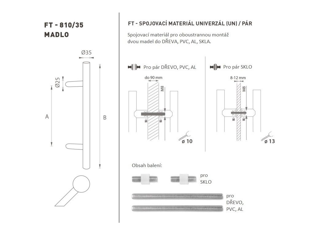 Madlo na dveře je vyrobeno z vysoce kvalitní nerezavějící oceli, známé jako nerez a je povrchově upraveno. Profil madla je 35 mm. Sada UNIVERZÁL (UN) obsahuje spojovací materiál pro oboustrannou montáž dvou madel do dřeva, PVC, AL, skla.