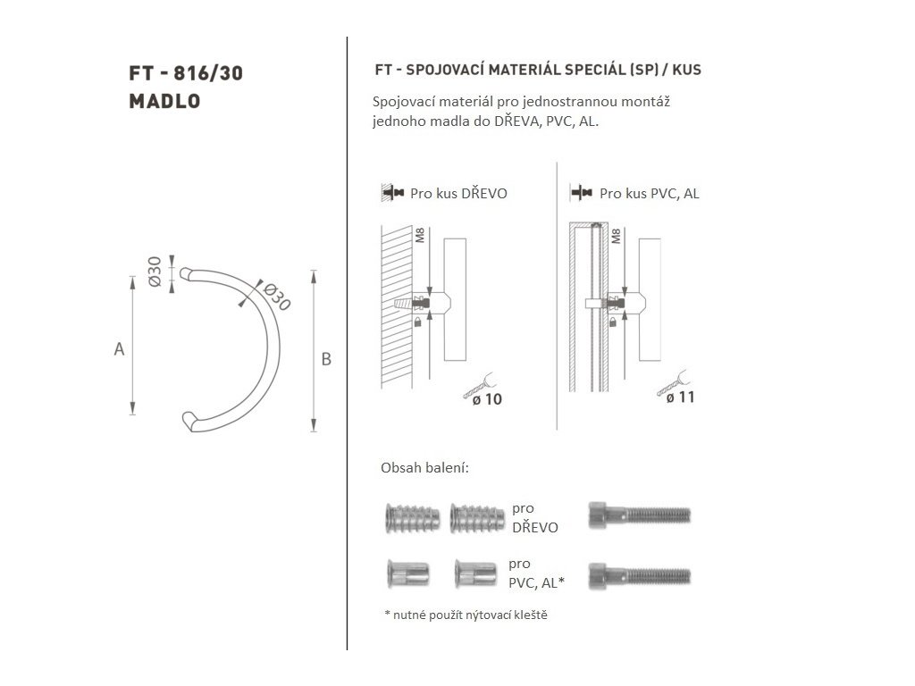 Madlo na dveře je vyrobeno z vysoce kvalitní nerezavějící oceli, známé jako nerez a je povrchově upraveno. Profil madla je 30 mm. Sada SPECIÁL (SP) obsahuje spojovací materiál pro jednostrannou montáž jednoho madla do dřeva, PVC, AL.