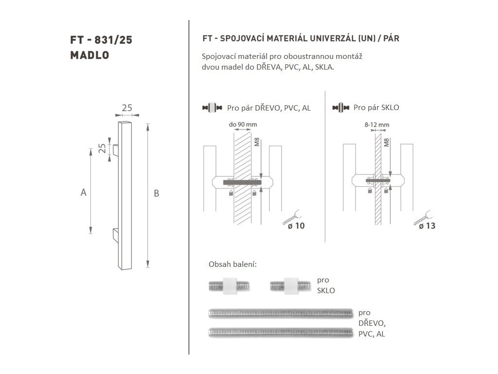 Madlo na dveře je vyrobeno z vysoce kvalitní nerezavějící oceli, známé jako nerez a je povrchově upraveno. Profil madla je 25 x 25 mm. Sada UNIVERZÁL (UN) obsahuje spojovací materiál pro oboustrannou montáž dvou madel do dřeva, PVC, AL, skla.