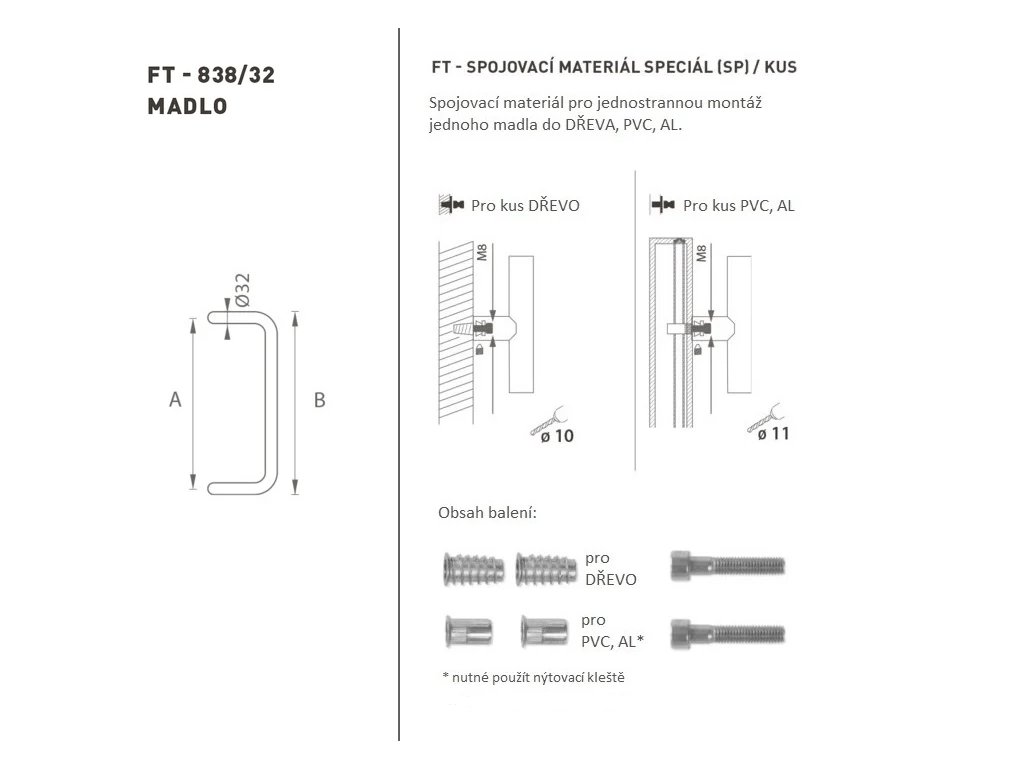 Madlo na dveře je vyrobeno z vysoce kvalitní nerezavějící oceli, známé jako nerez a je povrchově upraveno. Profil madla je 32 mm. Sada SPECIÁL (SP) obsahuje spojovací materiál pro jednostrannou montáž jednoho madla do dřeva, PVC, AL. Madlo s délkou 1600 mm má 3 úchyty.