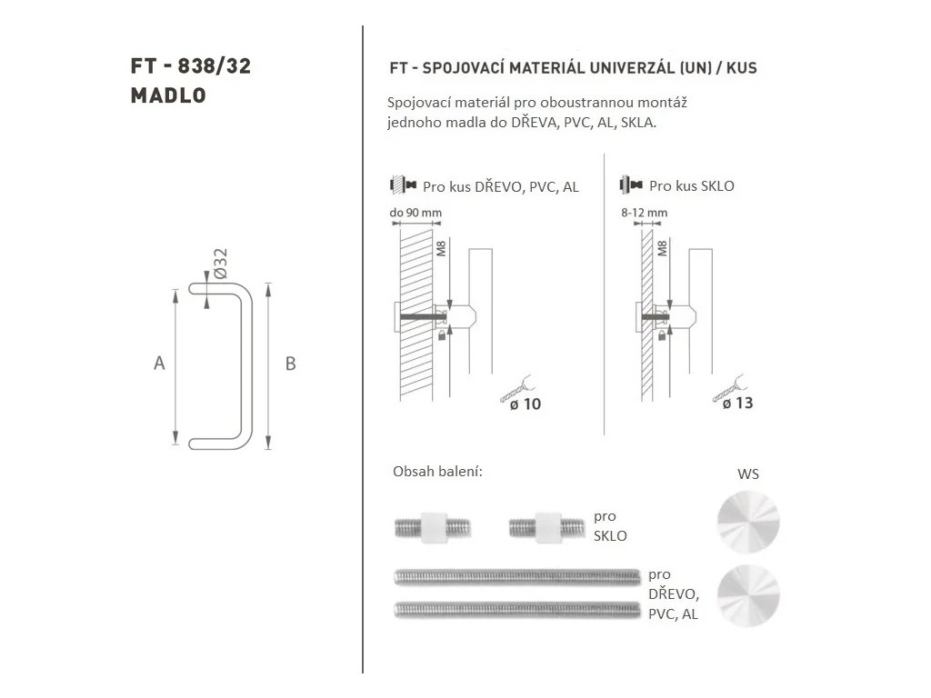 Madlo na dveře je vyrobeno z vysoce kvalitní nerezavějící oceli, známé jako nerez a je povrchově upravené. Profil madla je 32 mm. Sada UNIVERZÁL (UN) obsahuje spojovací materiál pro oboustrannou montáž dvou madel do dřeva, PVC, AL, skla.